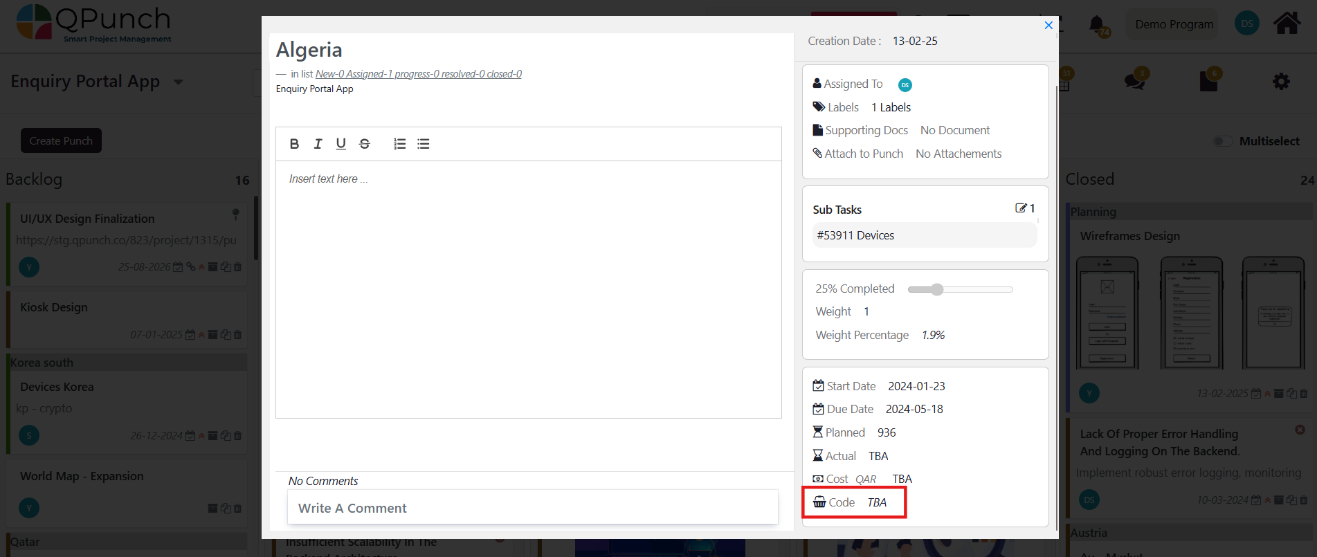 4. Once you enter the code in the group task, it will automatically sync to all associated subtasks. Navigate back to the Kanban Board to view the sub-tasks and confirm that the country code has been applied.