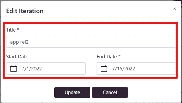 Step 2. List of options is reflected here. Choose Update Iteration option if there are changes with the Iteration title, and update start and end date of this Iteration.
