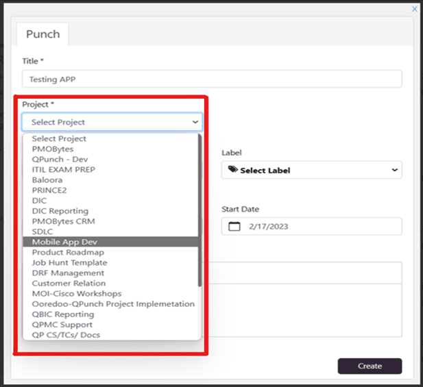 List of projects are reflected in the box. You can choose the relevant project to attach in your new created punch. Click create button to update.