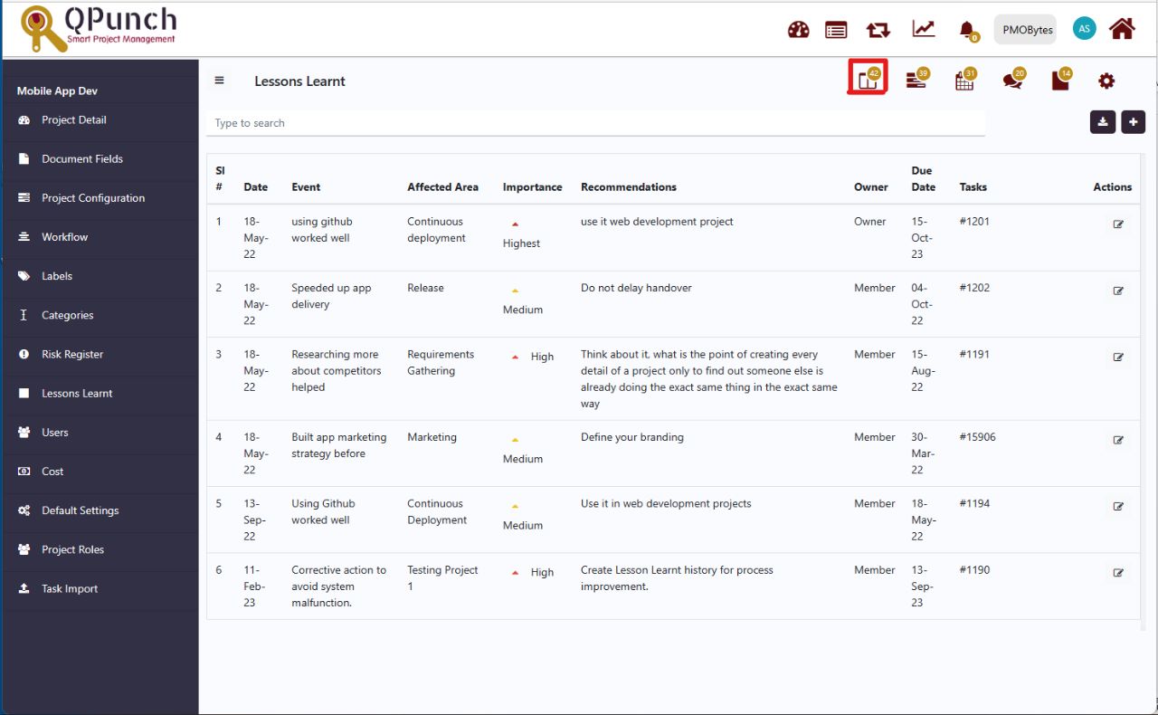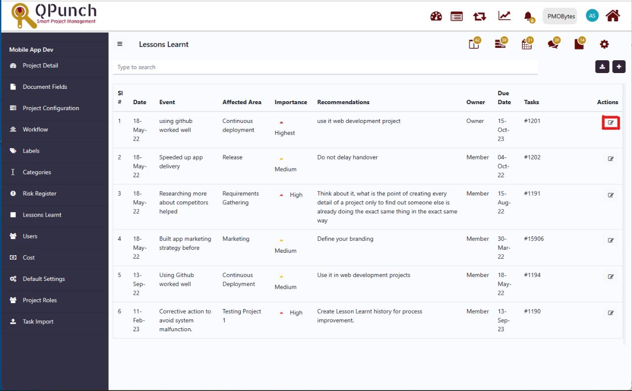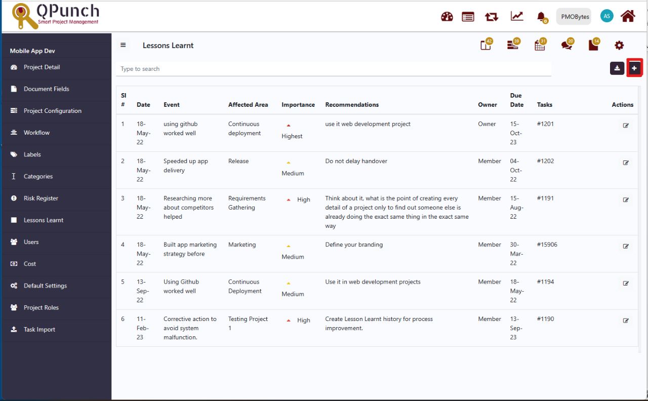 Step 3. Inside the Lesson Learnt tab the following are reflected Date, Event, Affected Areas, Importance, Recommendations, Owner, Due Date, Task, and Action. Know more about each functionality.