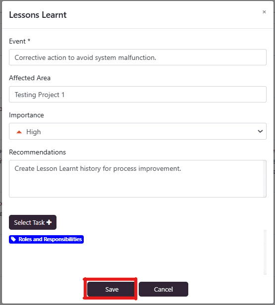 You can see in the image below the updated level of importance from Medium to Highest, and attached task reflected in blue color bar. Save to update Lesson Learnt Settings.